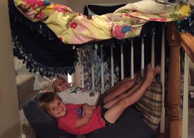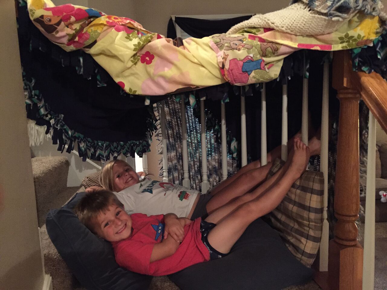 Homemade fort on the stairs. Bailey and Cole love to build forts with blankets.