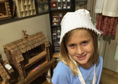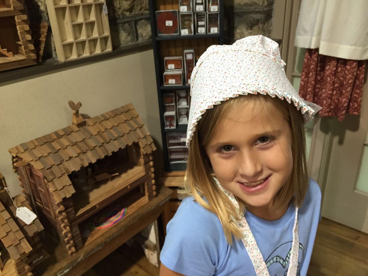 Bailey trying on a bonnet at the New Salem site where Abe Lincoln lived.