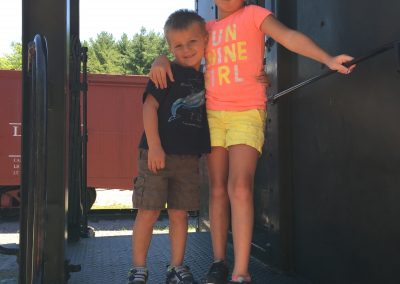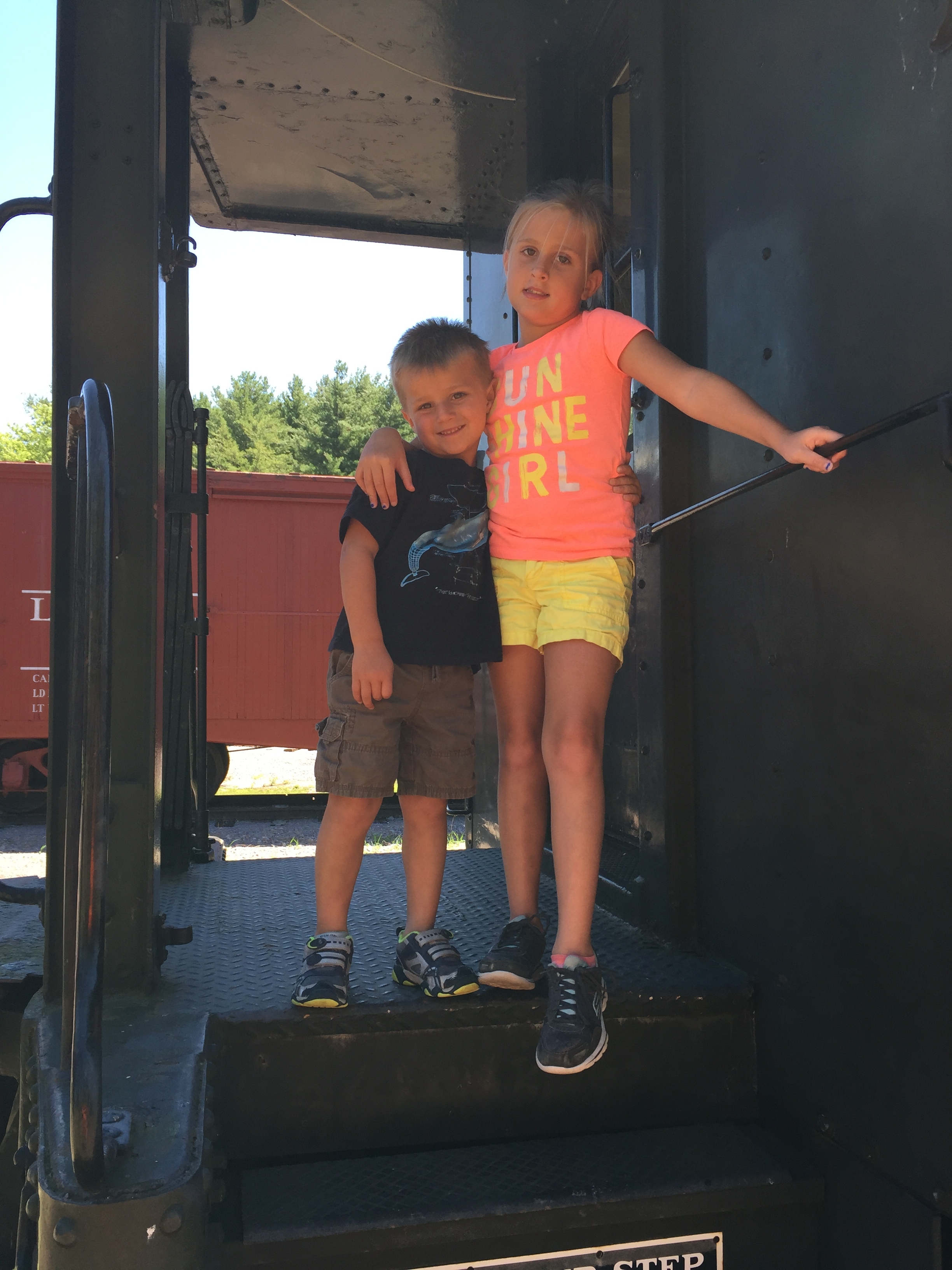 Bailey and Cole getting ready for an old-fashioned train ride in the Wisconsin Dells on a restored train.